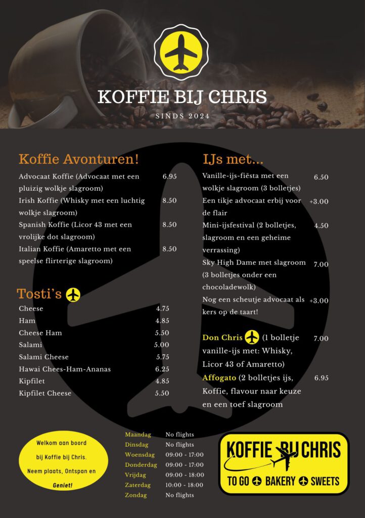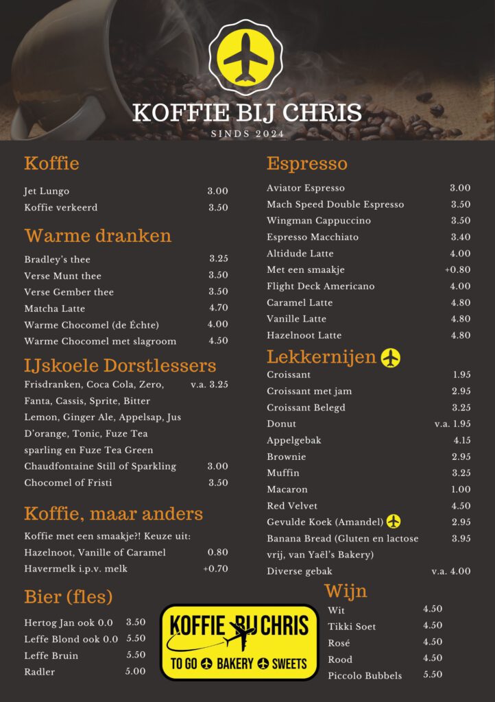 Stap binnen bij ‘Koffie bij Chris’, waar de wereld van koffie, lekkernijen, smoothies en een vleugje luchtvaart samenkomen. Geïnspireerd door jarenlange ervaring op Schiphol, brengen we de dynamiek en gastvrijheid van de luchtvaart naar jou toe. Onze koffie, met zorg bereid door gepassioneerde barista’s, nodigt je uit voor een smaakvolle reis.
